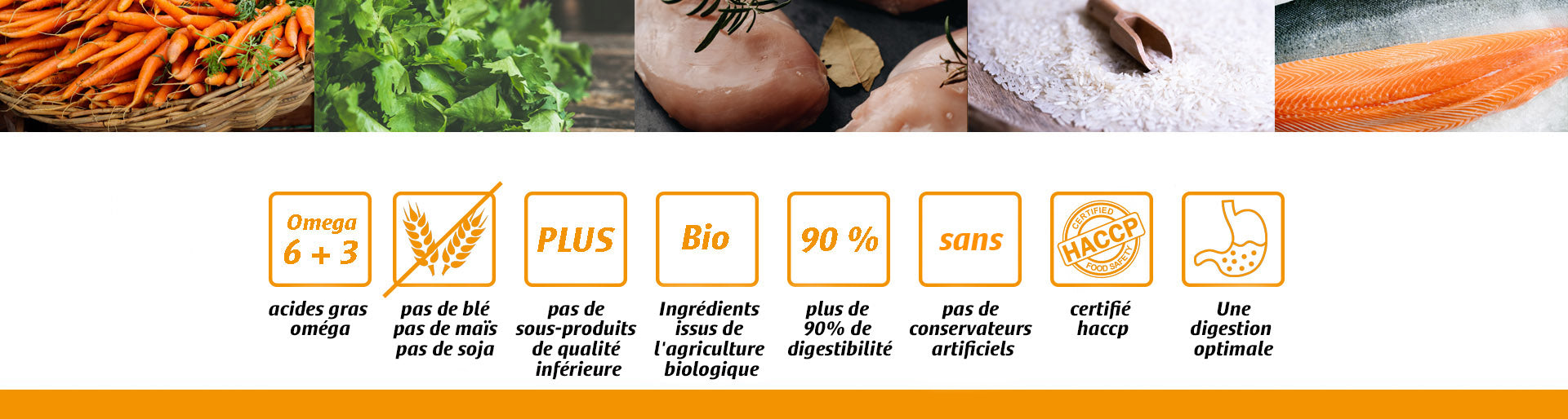 Les chiens et les chats ont besoin d'une grande quantité de protéines de haute qualité d'origine animale, car en tant que carnivores, c'est-à-dire mangeurs de viande, ils ne peuvent pas absorber correctement les protéines végétales. C'est pourquoi nous indiquons toujours la proportion de protéines animales sur nos emballages. La biodisponibilité des protéines est tout aussi importante.