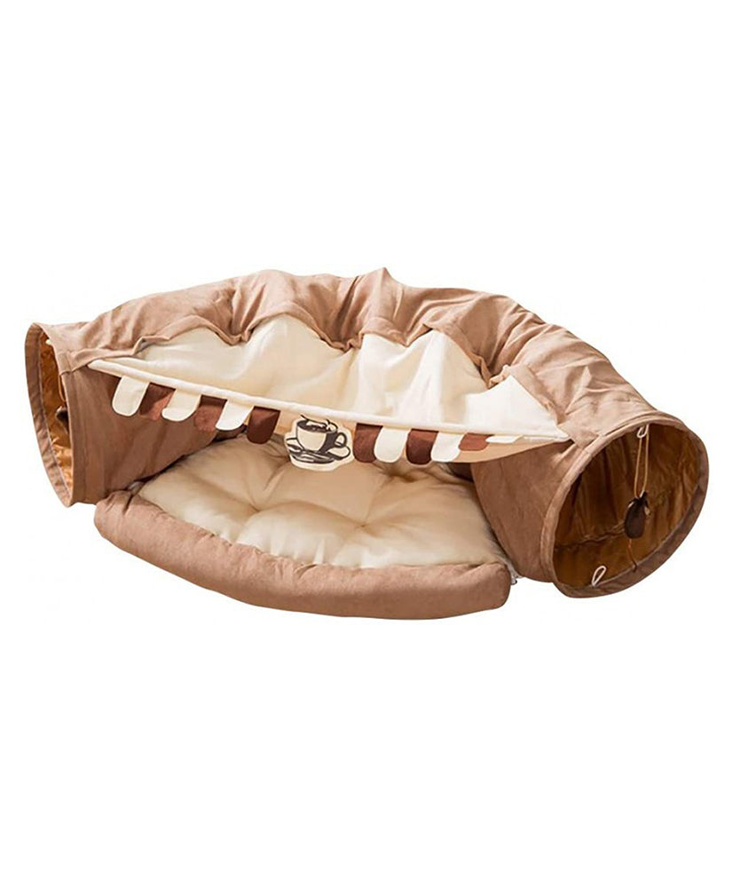 Maar de tunnel is ook ideaal om in te rusten, want hij heeft een geïntegreerd bed dat dankzij de ritssluiting bevestigd en verwijderd kan worden. Je kat zal net zo dol zijn op het warme, pluchen bed als op de kattentunnel, omdat je er comfortabel in kunt slapen. Het antislipmateriaal aan de onderkant van het bed voorkomt dat het wegglijdt. Het dak over het bed geeft je kat een veilig gevoel en het is decoratief versierd met een leuke slinger. Deze hoes kan ook worden verwijderd.